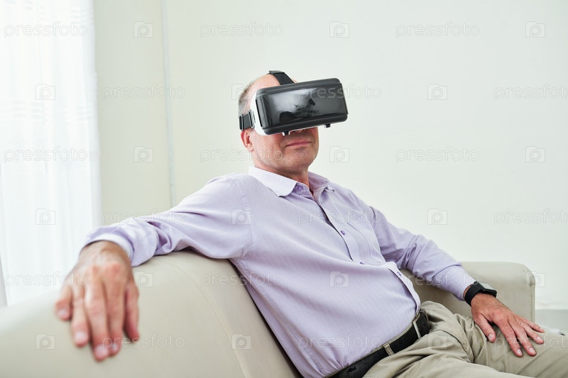 Мужчина в VR-очках отдыхает на диване