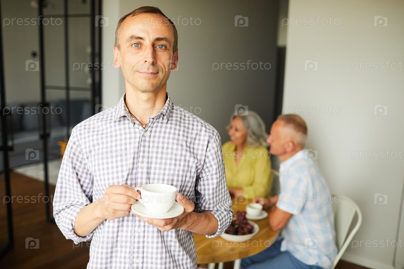 Зрелый мужчина позирует с чашкой чая