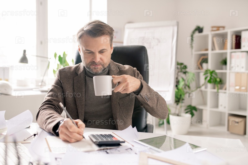 Серьезный зрелый бухгалтер с ручкой и чашей кофе делает расчеты