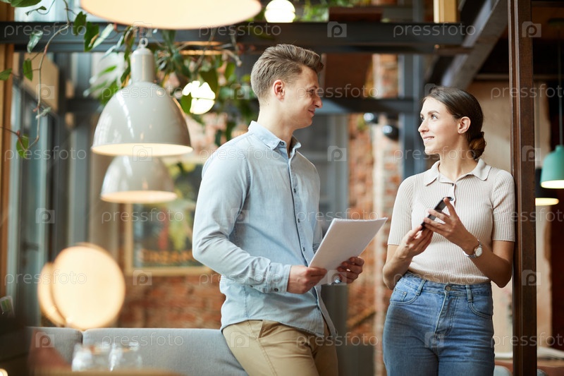 Положительно удовлетворенные молодые коллеги в повседневной одежде, стоящие в уютном кафе и использующие смартфон и отчет об анализе рынка при разработке онлайн-проекта