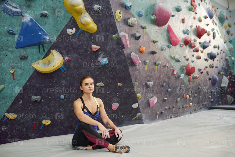 Молодая спокойная женщина с пересеченными ногами, сидящая на коврике в спортзале после тренировки