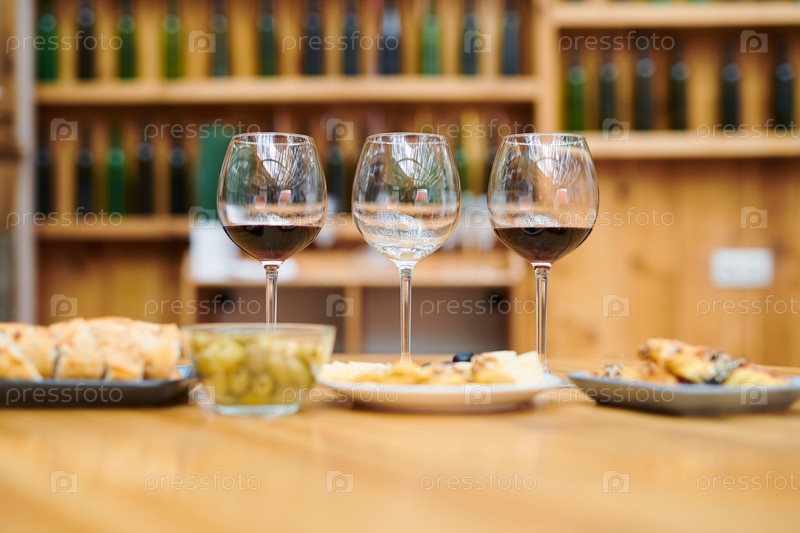 Ряд бокалов вина с красным вином и закусками рядом готовят для сомелье