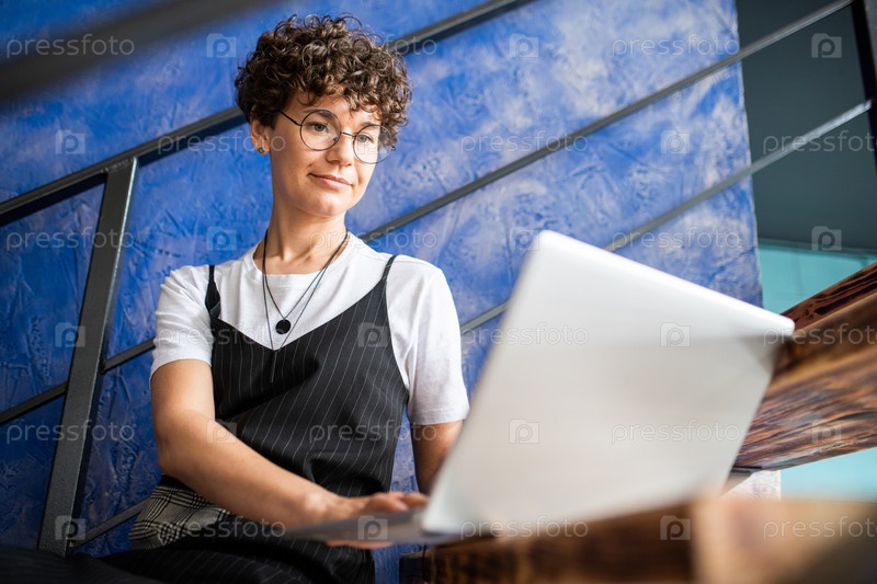 Современная женщина смотрит на дисплей ноутбука, работая над новым проектом