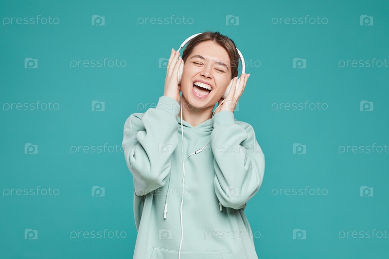 Счастливая беззаботная хипстерская девушка в капюшоне, носящая наушники и поющая громко, слушая музыку, копируя пространство