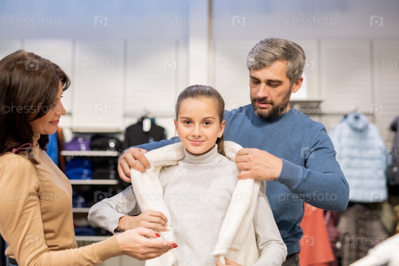 Молодые родители помогают своей дочери пробовать новый теплый жилет