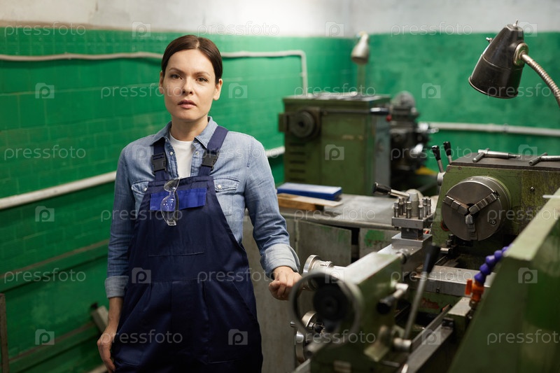 Портрет серьезной женщины средних лет в целом с висящими очками безопасности, стоящей у ручного токарного станка на промышленном семинаре