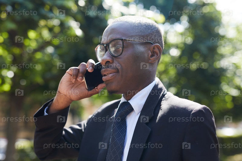 Афроамериканский бизнесмен говорит со смартфона