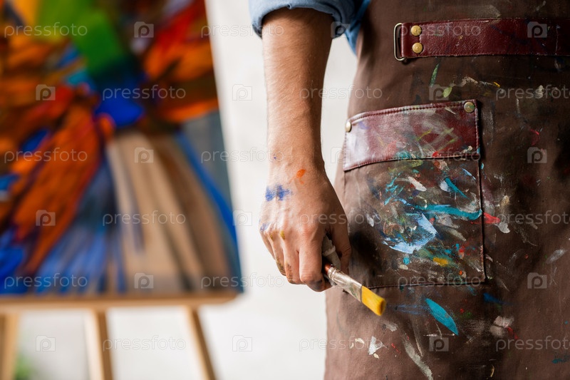 Часть профессионального художника в грязном фартуке, держащего кисть в руке