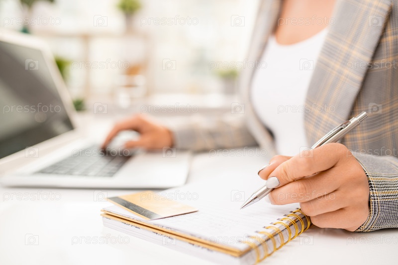 Рука бизнес-женщины с ручкой на пустой странице блокнота с пластиковой картой