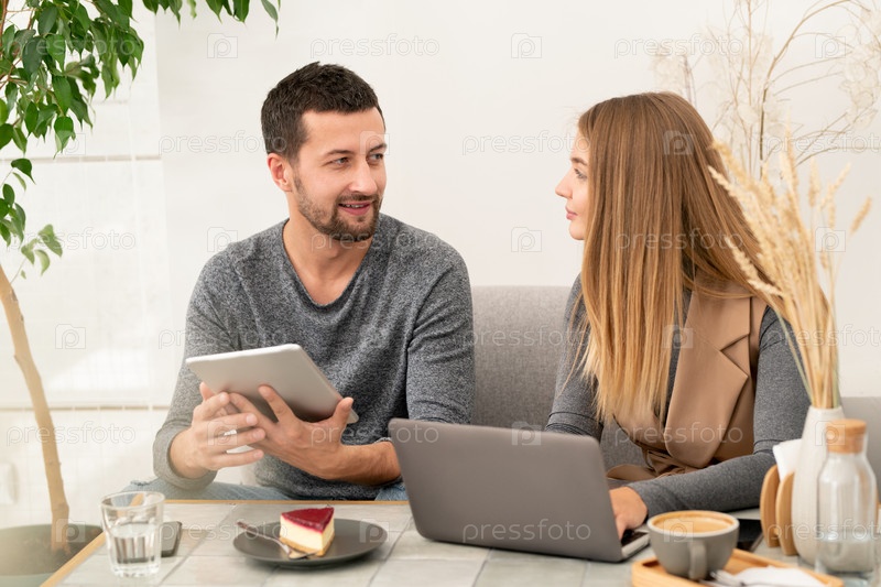 Уверенный бизнесмен с сенсорным панелем смотрит на своего коллегу во время обсуждения