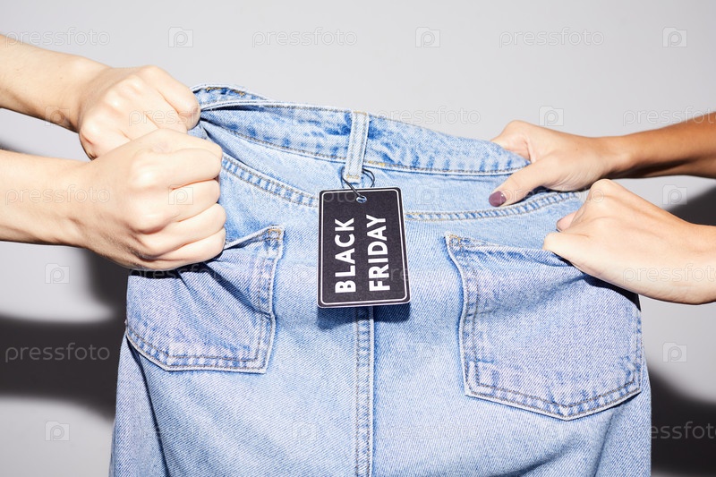 Обрезанное изображение неизвестных женщин, захватывающих джинсы и сражающихся за них на распродаже одежды в черную пятницу