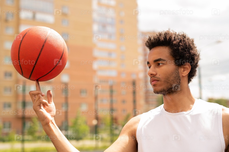 Молодой профессиональный баскетболист в белом футболке, держащий мяч на указательном пальце