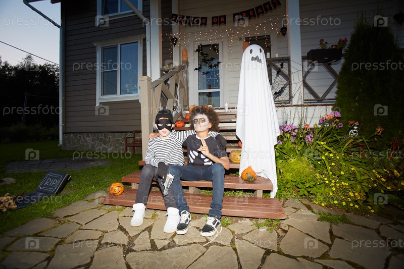 Мальчики, позирующие в Decorated House на Хэллоуин