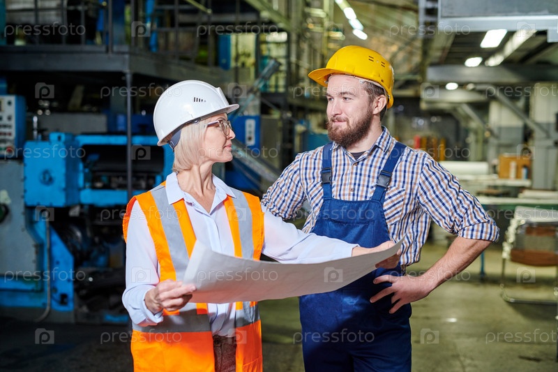 Содержимое опытных инженеров в жестких шляпах, стоящих на фабрике и смотрящих друг на друга во время работы с чертежом