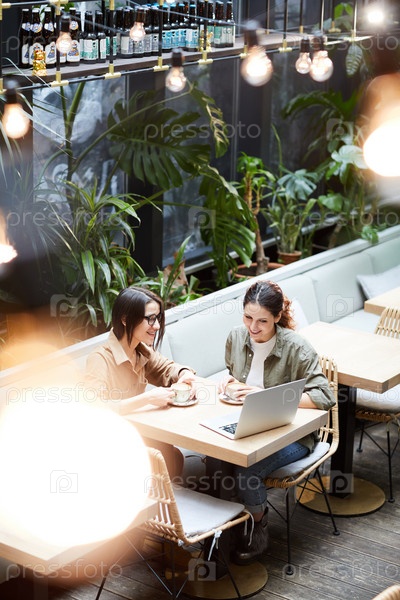 Женщины смотрят презентацию на ноутбуке Content women watching presentation on laptop