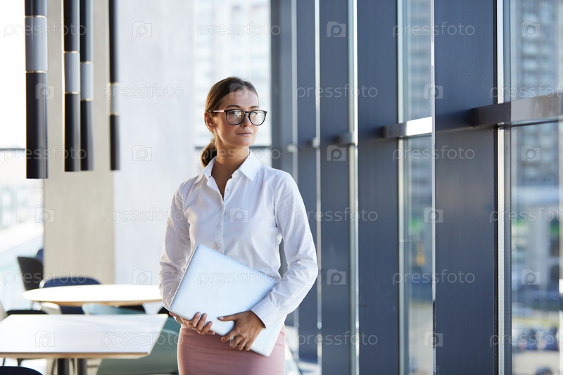 Портрет содержания привлекательная деловая женщина в белой блузке стоит в современном офисном лобби и держит ноутбук