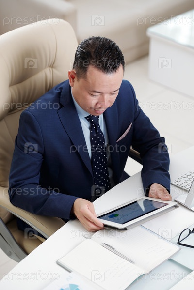 Бизнесмен, работающий онлайн на планшетном компьютере