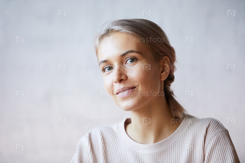 Портрет улыбающейся привлекательной молодой женщины с красивым цветом волос, одетой в уютный свитер
