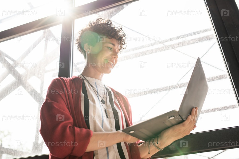 Молодая бизнес-леди держит перед собой ноутбук, глядя на дисплей