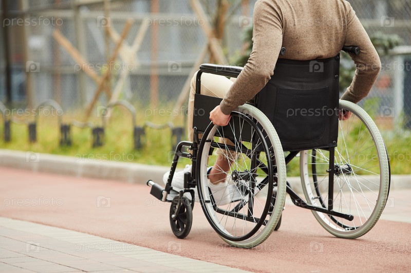 Непризнанный инвалид в коричневом свитере, сидящий на современной инвалидной коляске и вращающий руками колеса кресла при ходьбе один