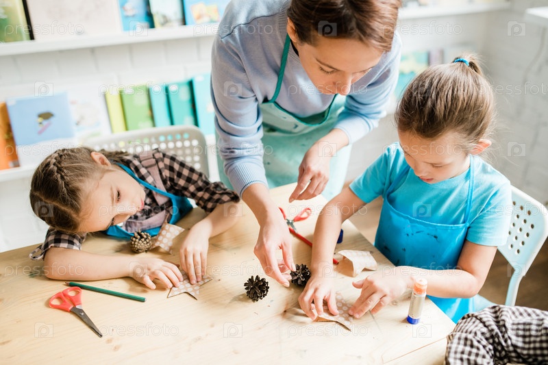 Молодая женщина помогает одной из школьниц с ремесленными рождественскими украшениями на уроке