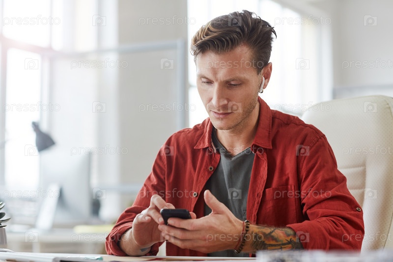Татуированный бизнесмен использует смартфон на рабочем месте