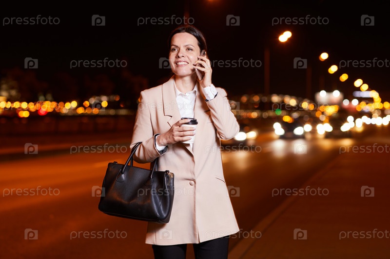 Веселая привлекательная бизнес-леди в длинной куртке разговаривает по сотовому телефону, ожидая такси на дороге