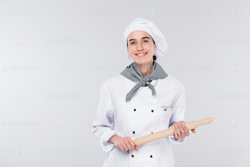 Красивый молодой улыбающийся шеф-повар в белой форме, держащий рулон во время приготовления пищи