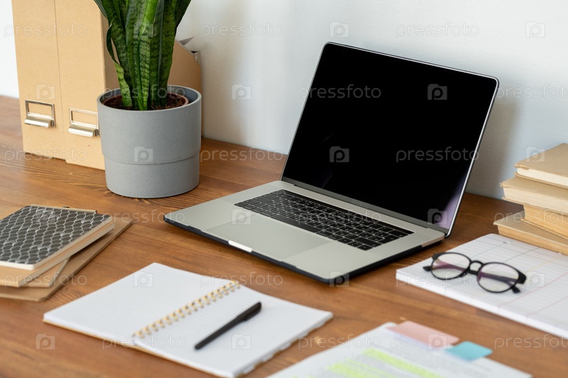 Рабочее место сотрудника домашнего офиса с ноутбуком, очками, открытой тетрадью и ручкой