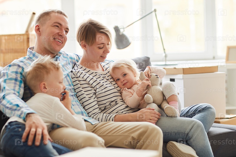 Молодая семья обнимает друг друга на диване