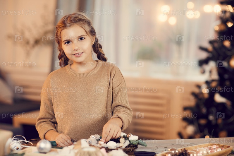 Портрет счастливой красивой вязаной девушки в свитере, стоящей за столом в гостиной и украшающей рождественский венок