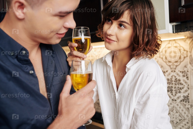 Пара пьет белое вино на кухне