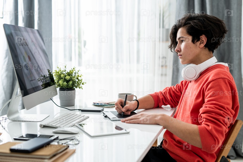 Серьезный мужской графический дизайнер смотрит на компьютерный экран, ретушируя фотографии