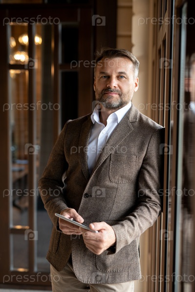 Успешный зрелый элегантный бизнесмен с планшетом смотрит на тебя