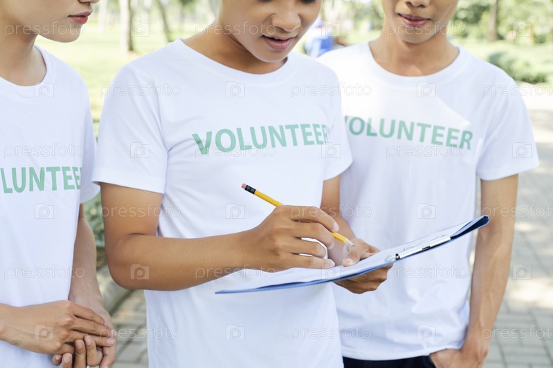 Группа добровольцев с клипбордами на открытом воздухе