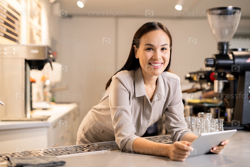 Счастливая молодая бариста с цифровым планшетом загружает новое меню