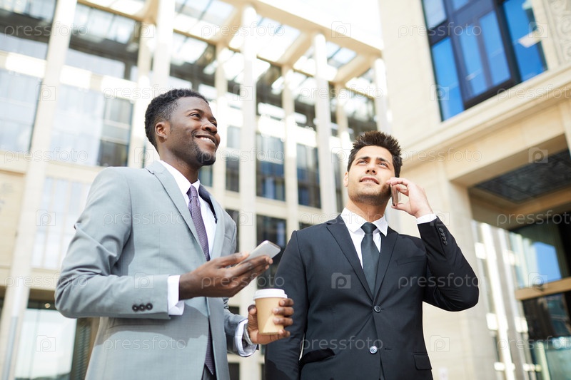 Два менеджера используют телефоны на открытом воздухе