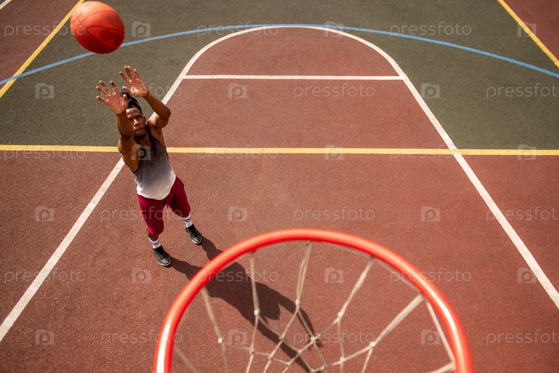 Молодой профессиональный баскетболист в активной одежде, бросающий мяч в корзину