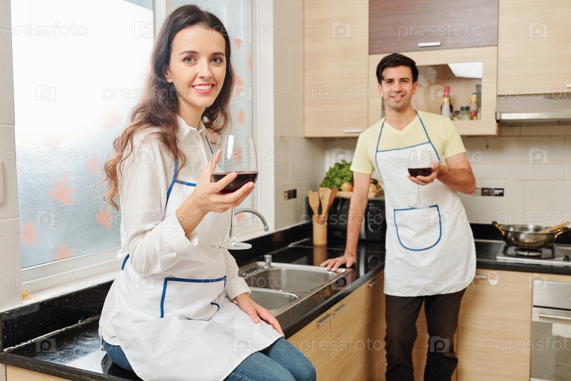 Пара пьет вино после приготовления пищи