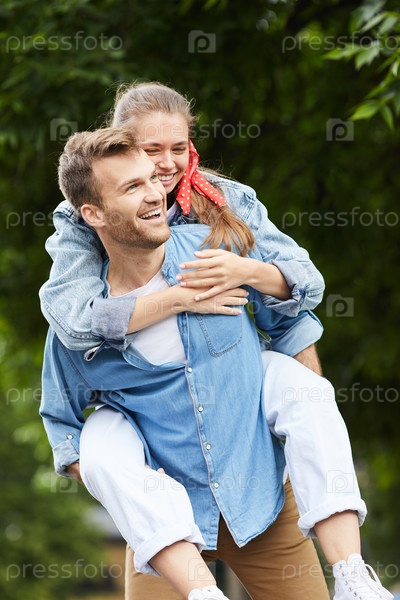 Счастливая возбужденная молодая пара в обычной одежде, гуляющая вместе в летнем парке: мужчина несет на спине свою девушку