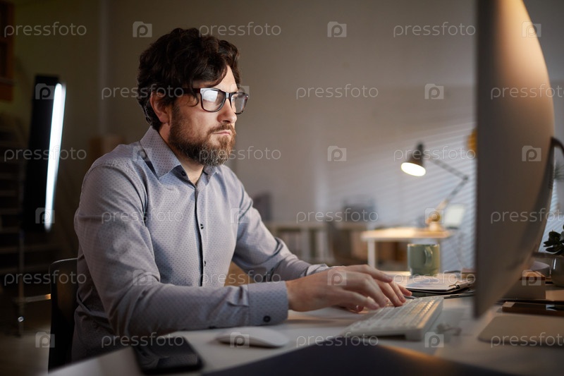 Мужчина, работающий на компьютере в офисе