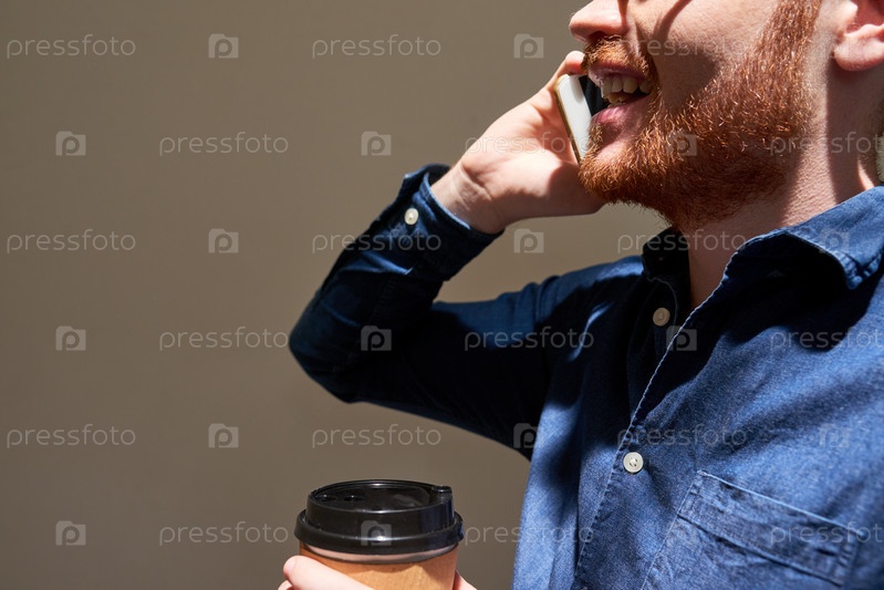 Мужчина звонит и пьет кофе