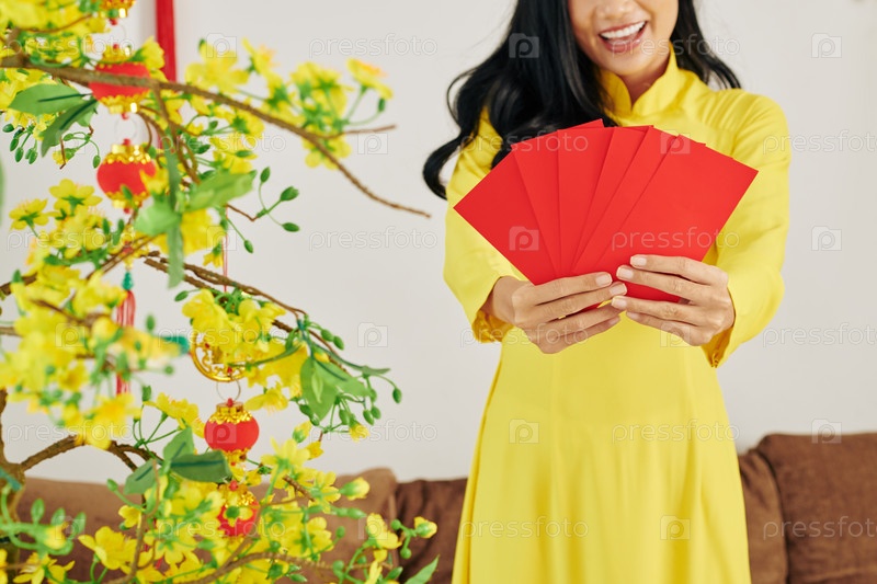 Женщина показывает конверты с подарками