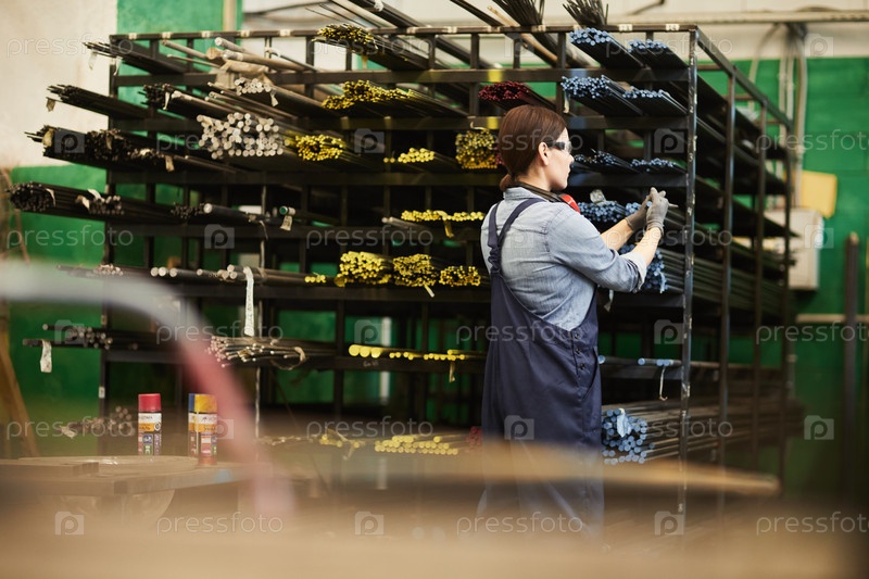 Задний вид женщины-работницы склада в комбинезонах, стоящей у металлических полок с красочными палочками и сортирующей их на фабрике