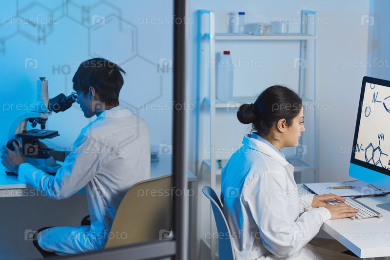 Загруженные молодые мультиэтнические химики в лабораторных пальто, сидящие за столами в современной лаборатории и работающие над исследованиями