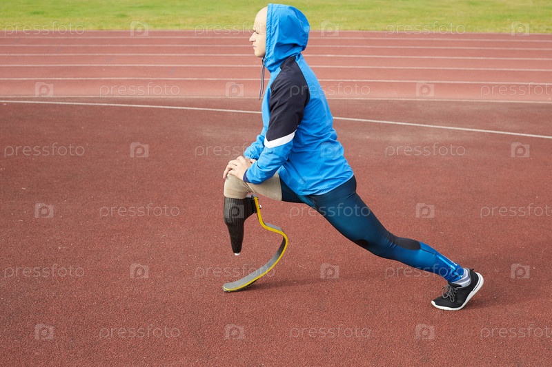 Серьезный целенаправленный молодой спортивный парень в беговом лезвии, опирающийся на колено во время растяжения ампутированной ноги на открытом стадионе