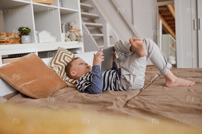 Серьезный расслабленный мальчик в повседневной одежде, лежащий на кровати и использующий современный планшет во время просмотра видео на планшете