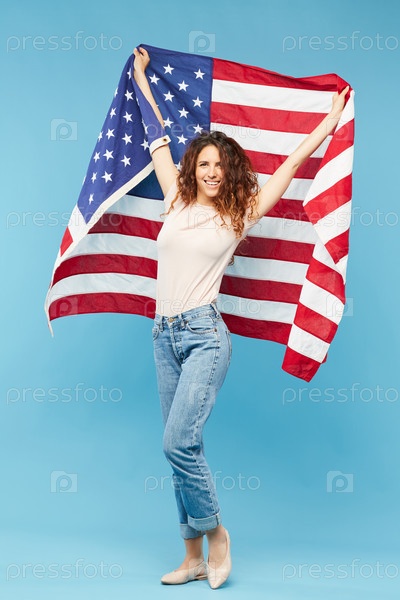 Молодая веселая женщина с длинными темно-крутыми волосами, держащая флаг США