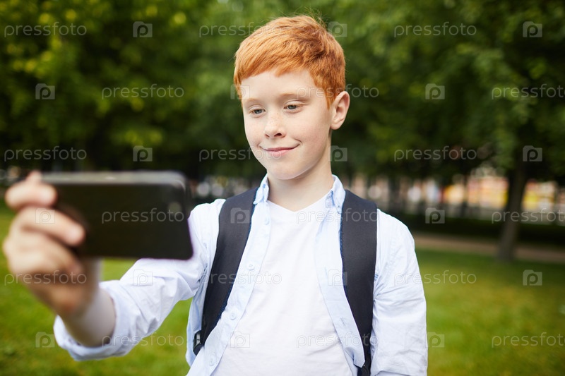 Современный ученик-мужчина делает селфи в парке