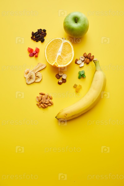 Высокоугольный вид поперечного сечения апельсина, яблока, банана, жареных фруктов и орехов на желтом фоне